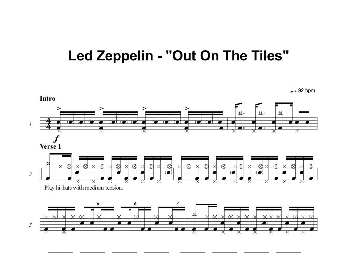 《Out On The Tiles》是Led Zeppelin演唱的一首歌曲,这份架子鼓谱共有六张高清图谱,图谱由 @庄颜 编配上传,图谱使用五线谱编配,使用这份Out On The Tiles架子鼓谱,你将能够轻松地敲打出这首Led Zeppelin的Out On The Tiles,快来尝试吧。