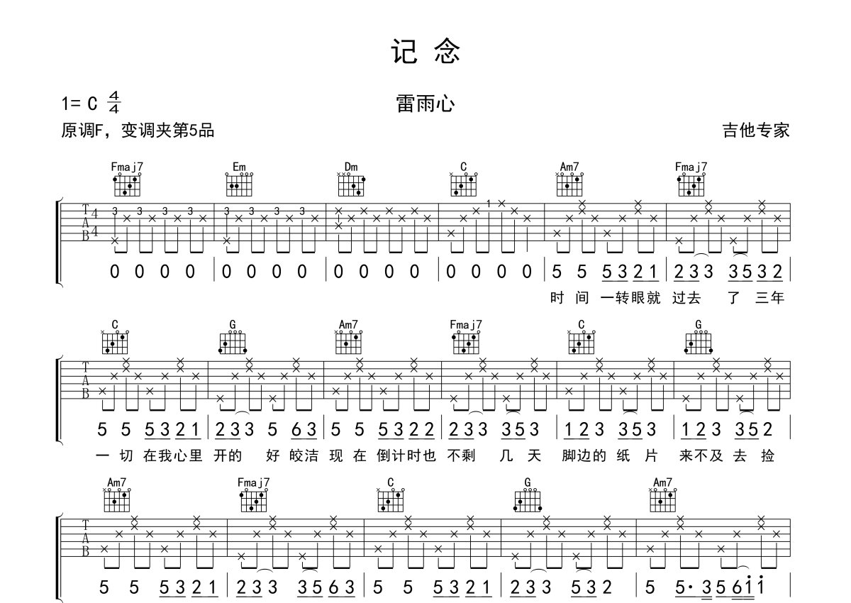 雷雨心《纪念》吉他谱 - C调弹唱六线谱