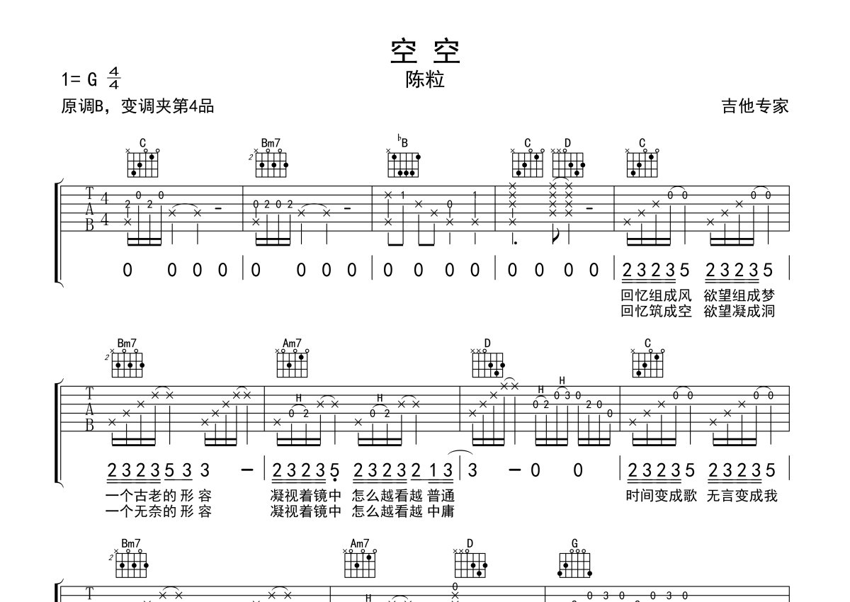 陈粒《空空》吉他谱 - G调弹唱六线谱