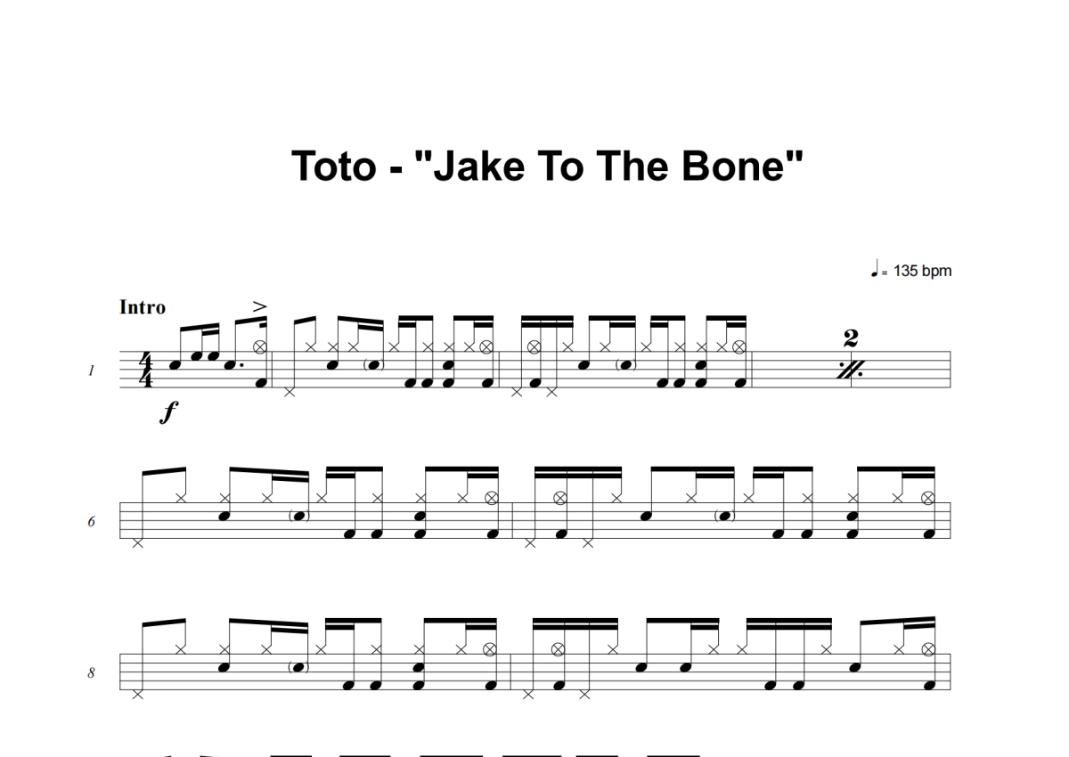 《Jake To The Bone》是Toto演唱的一首歌曲,这份架子鼓谱共有十一张高清图谱,图谱由 @庄颜 编配上传,图谱使用五线谱编配,使用这份Jake To The Bone架子鼓谱,你将能够轻松地敲打出这首Toto的Jake To The Bone,快来尝试吧。