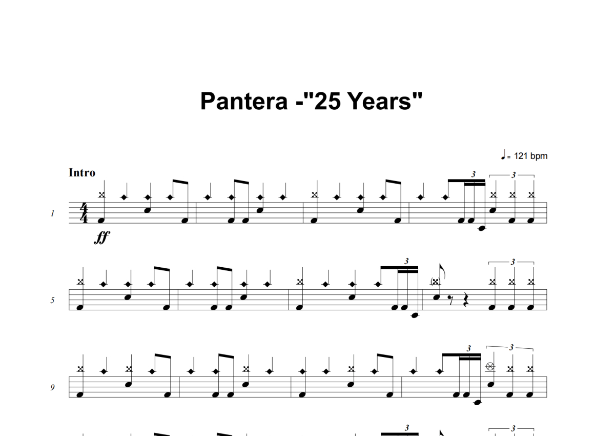 《25 Years》是Pantera演唱的一首歌曲,这份架子鼓谱共有七张高清图谱,图谱由 @庄颜 编配上传,图谱使用五线谱编配,使用这份25 Years架子鼓谱,你将能够轻松地敲打出这首Pantera的25 Years,快来尝试吧。