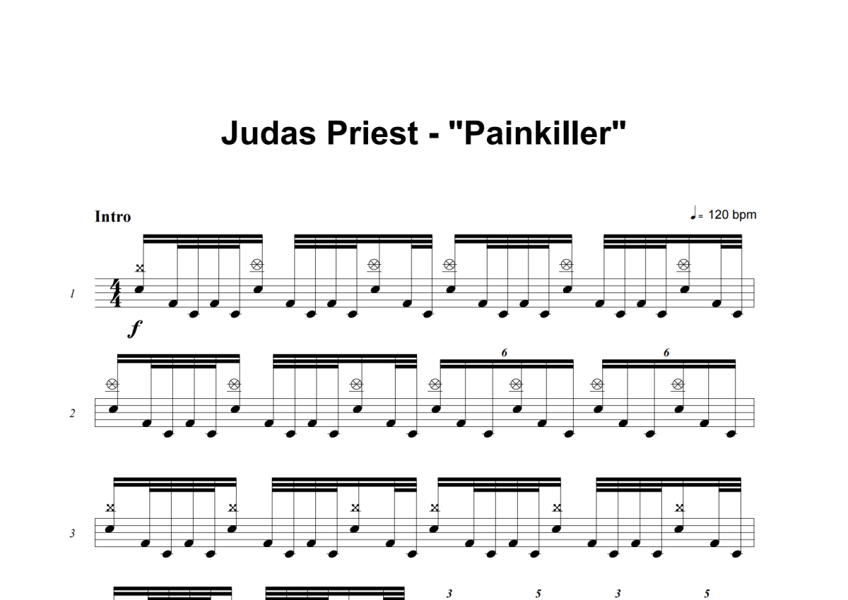 《Painkiller》是Judas Priest演唱的一首歌曲,这份架子鼓谱共有十一张高清图谱,图谱由 @庄颜 编配上传,图谱使用五线谱编配,使用这份Painkiller架子鼓谱,你将能够轻松地敲打出这首Judas Priest的Painkiller,快来尝试吧。