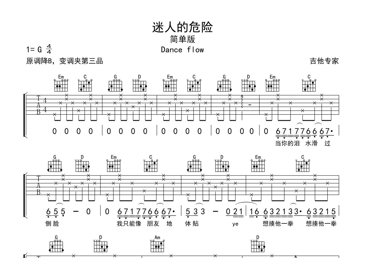 dance flow《迷人的危险》吉他谱 - G调弹唱六线谱 - 简单版