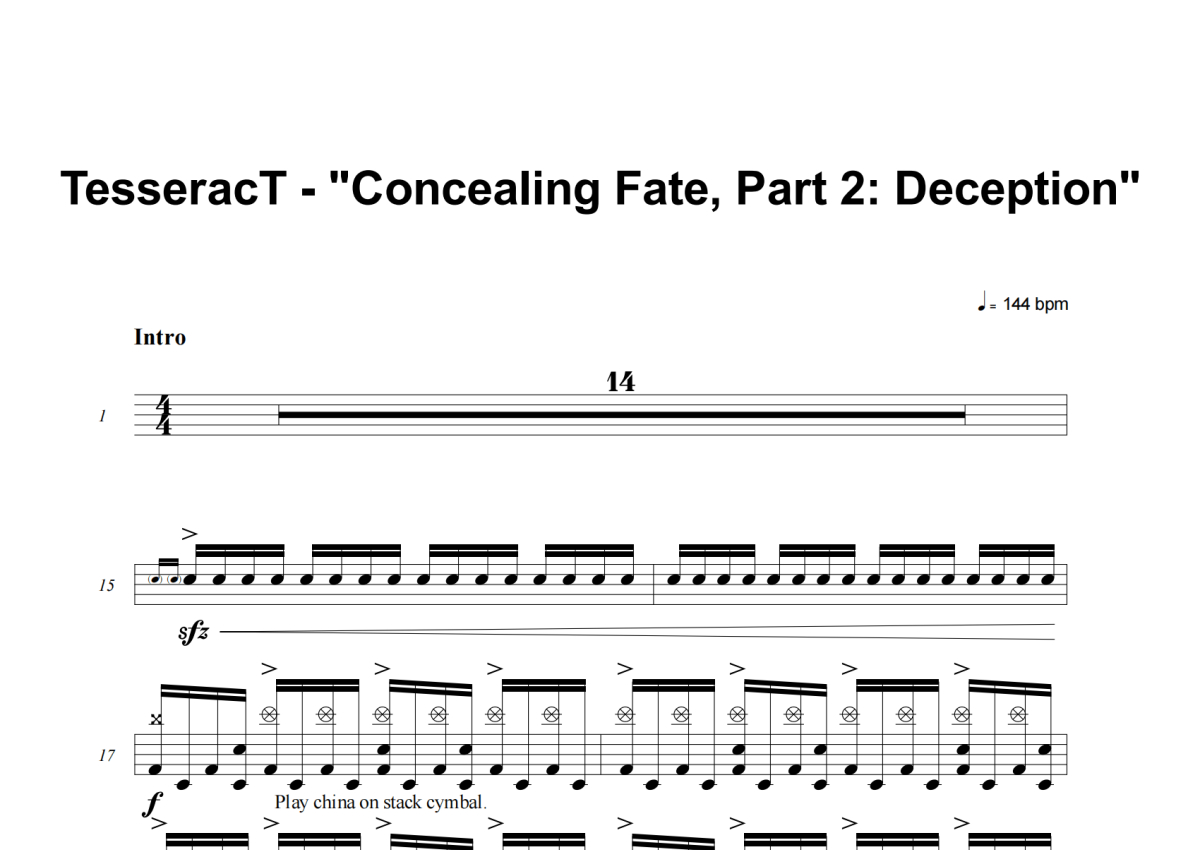 《Deception》是TesseracT演唱的一首歌曲,这份架子鼓谱共有十张高清图谱,图谱由 @庄颜 编配上传,图谱使用五线谱编配,使用这份Deception架子鼓谱,你将能够轻松地敲打出这首TesseracT的Deception,快来尝试吧。
