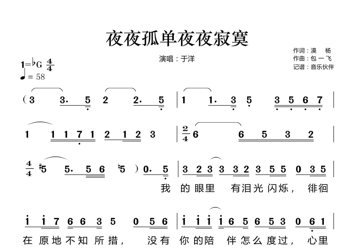 《夜夜孤单夜夜寂寞》是于洋演唱的一首歌曲,拍号为4/4拍,歌曲速度为每分钟58拍,这份简谱共有两张高清图谱,图谱由 @音乐伙伴 编配上传。