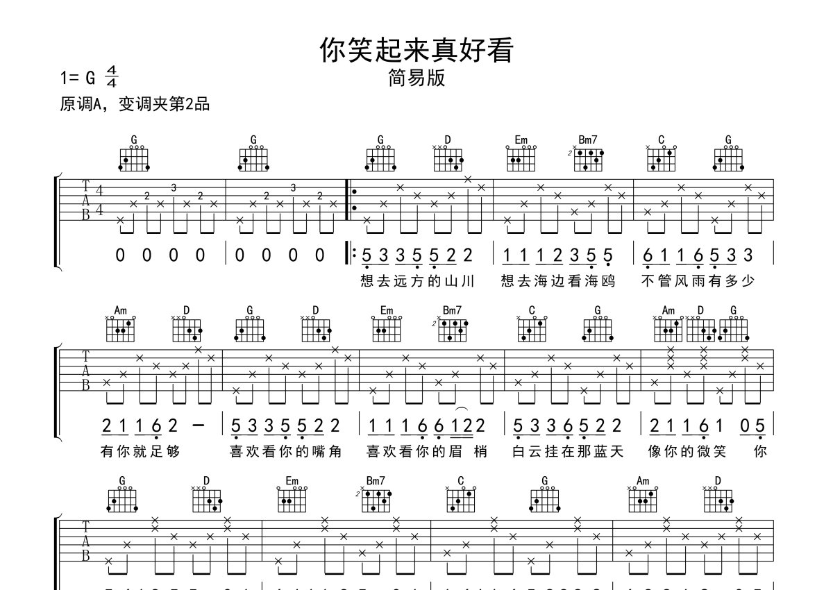 李昕融/樊桐舟/李凯稠《你笑起来真好看》吉他谱 - G调弹唱六线谱 - 简易版