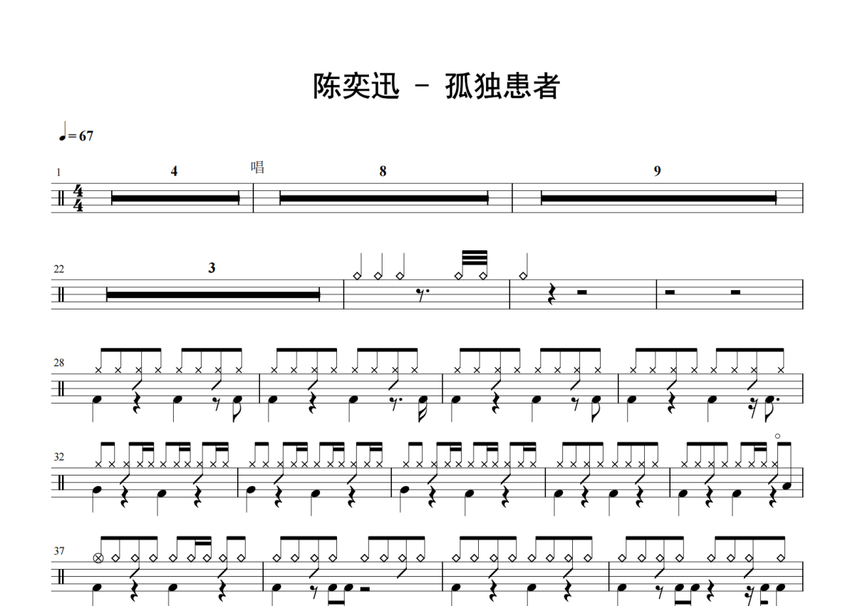 《孤独患者》是陈奕迅演唱的一首歌曲,这份架子鼓谱共有两张高清图谱,图谱由 @16分音符 编配上传,图谱使用五线谱编配,使用这份孤独患者架子鼓谱,你将能够轻松地敲打出这首陈奕迅的孤独患者,快来尝试吧。
