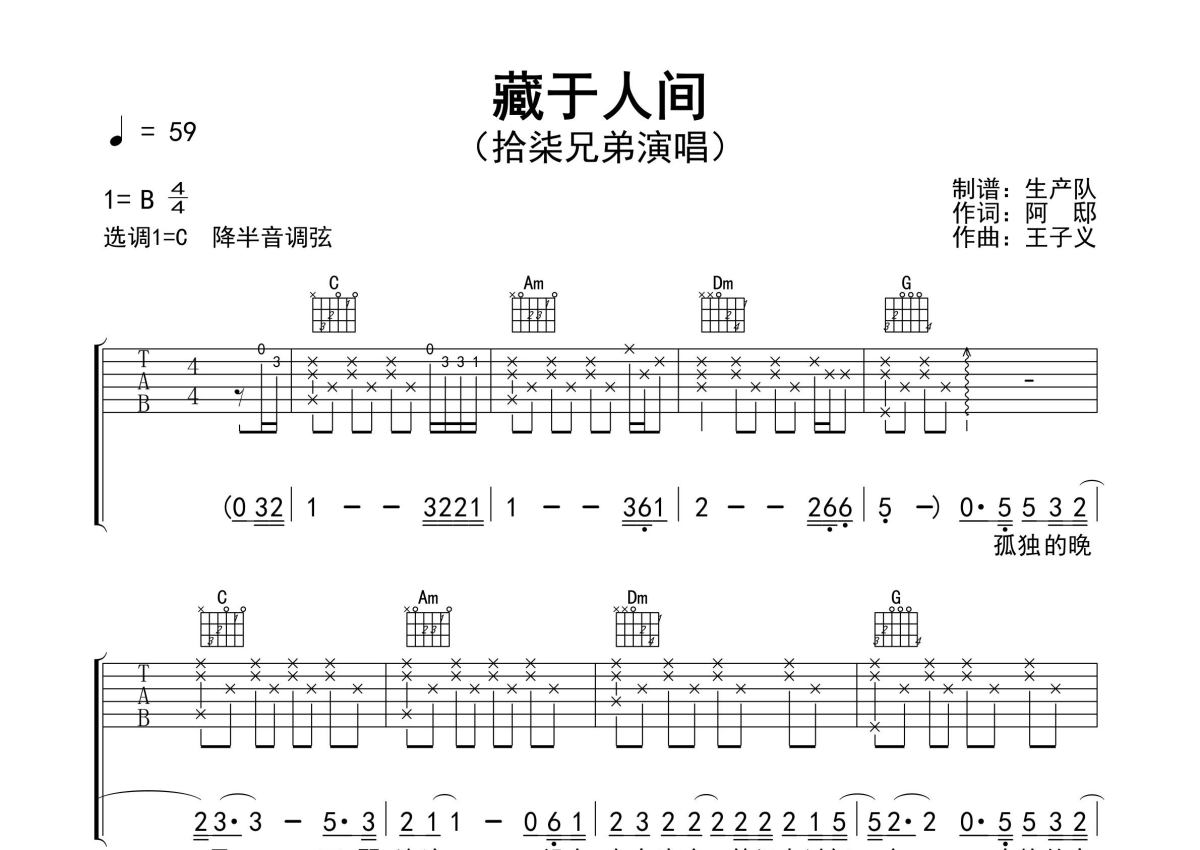 《藏于人间》是拾柒兄弟演唱的一首歌曲,精编完美版,拍号为4/4拍,歌曲速度为每分钟59拍,歌曲原调为B调,但由于原调指法比较难,为了方便弹奏,本吉他谱采用的是C调指法编配,降半音调弦弹奏即为原调,当然也可以根据自己的音域决定是否调弦,这份吉他谱共有三张高清图谱,图谱由 @生产队 编配上传,图谱使用六线谱编配,包含吉他和弦指法、简谱以及歌词部分,使用这份藏于人间吉他谱,可以让你更加方便地掌握这首歌曲的弹唱技巧,快来尝试吧。拾柒兄弟演唱的歌曲《藏于人间》原版吉他谱,含前奏、间奏solo编配,精编完美版,值得推荐!。