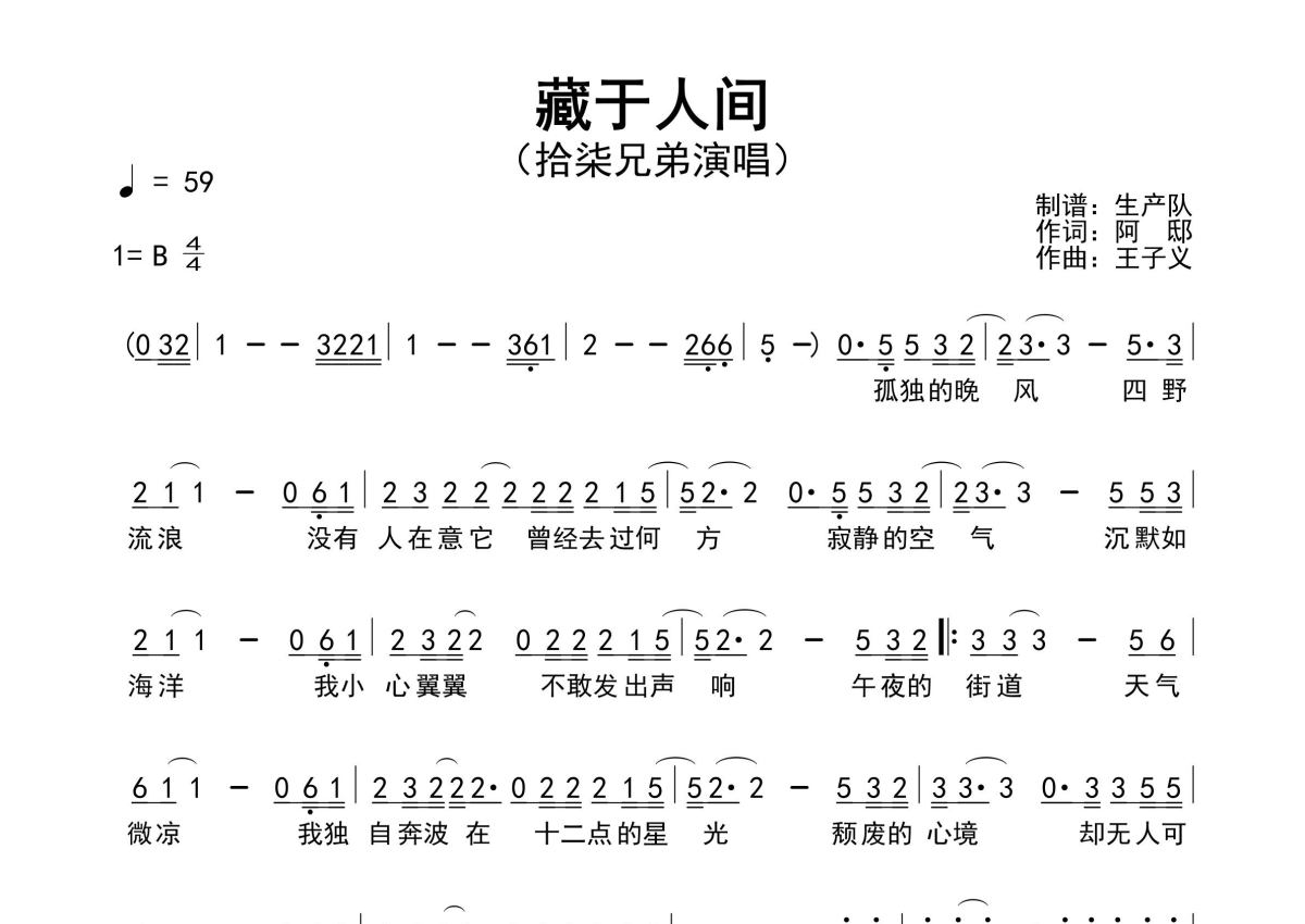 《藏于人间》是拾柒兄弟演唱的一首歌曲,原版简谱,拍号为4/4拍,歌曲速度为每分钟59拍,这份简谱共有一张高清图谱,图谱由 @生产队 编配上传拾柒兄弟演唱的歌曲《藏于人间》原版简谱,含前奏、间奏solo编配,精编完美版,值得推荐!。