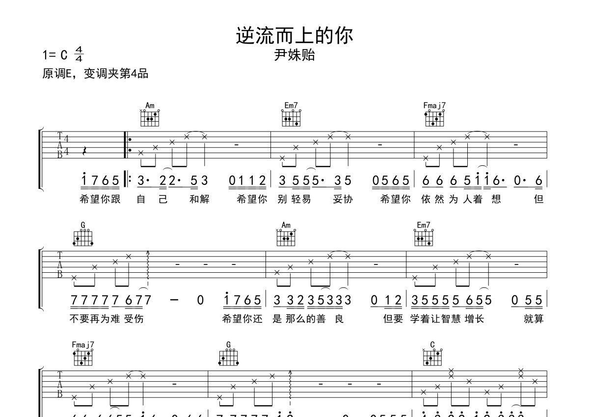 尹姝贻《逆流而上的你》吉他谱 - C调弹唱六线谱