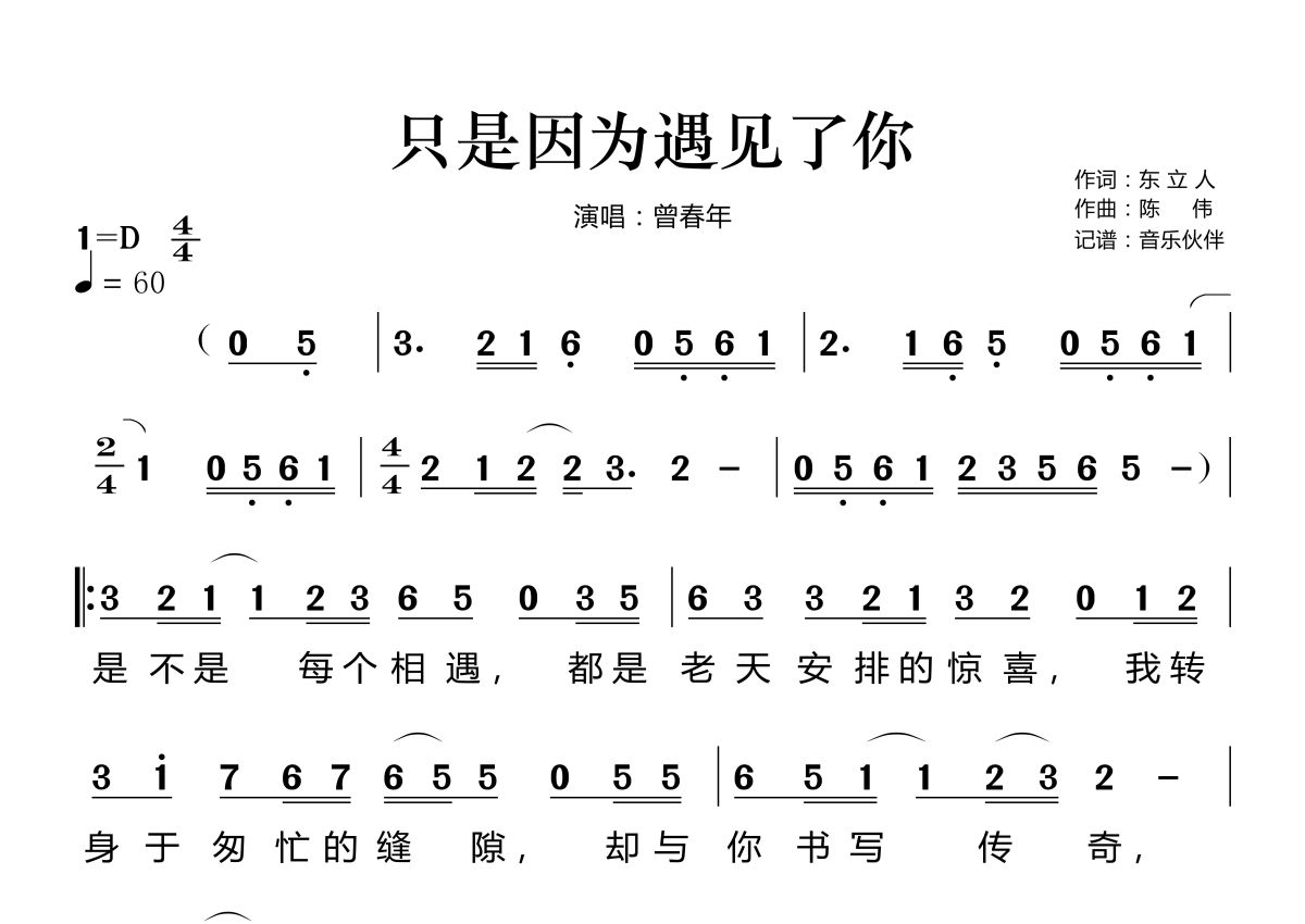 只是因为遇见了你简谱 - 曾春年演唱