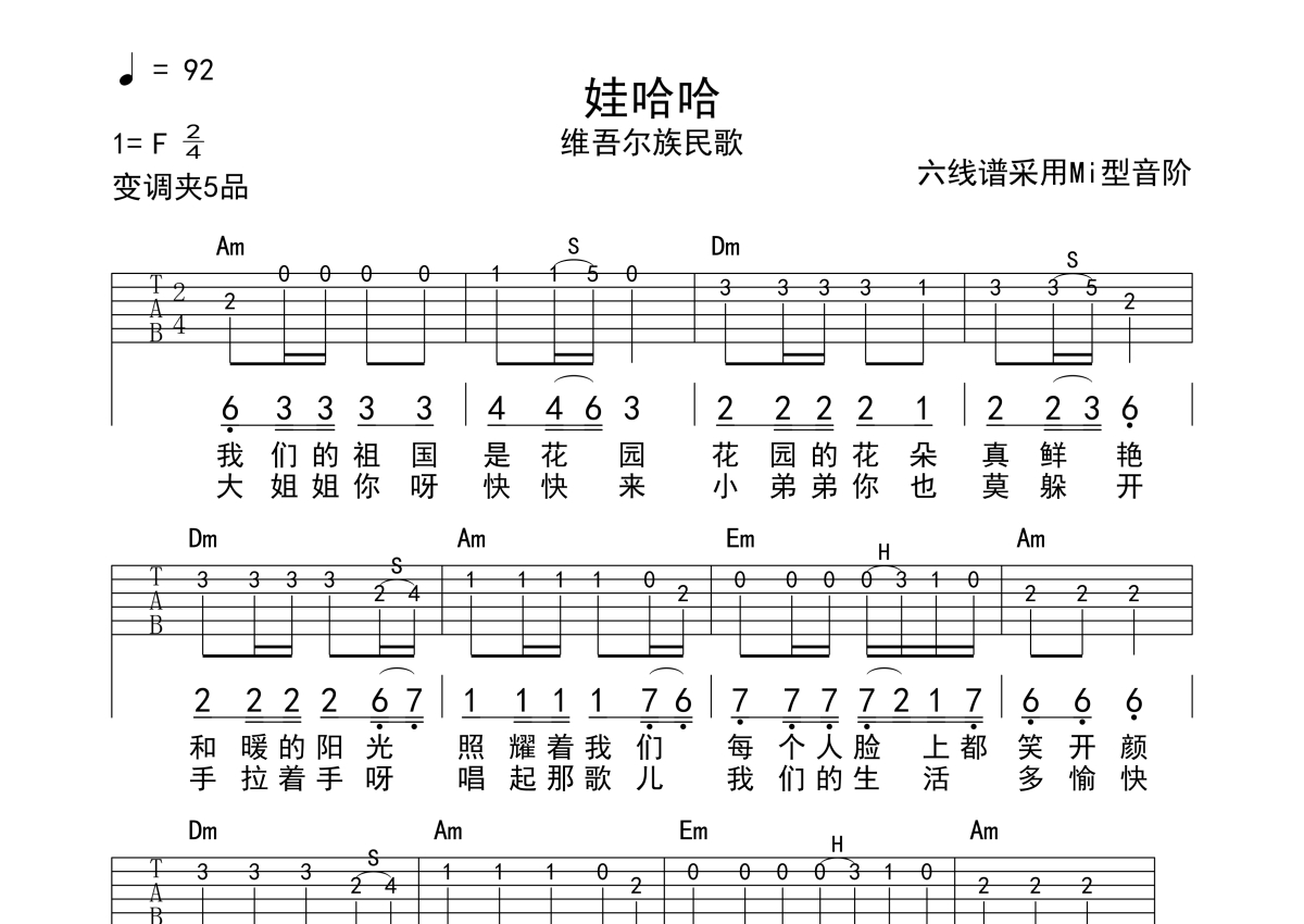 娃哈哈+两只老虎吉他谱 - 儿歌演唱 - C调独奏solo六线谱