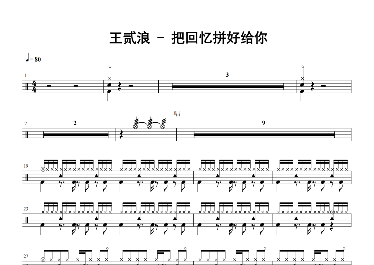 《把回忆拼好给你》是王贰浪演唱的一首歌曲,这份架子鼓谱共有三张高清图谱,图谱由 @16分音符 编配上传,图谱使用五线谱编配,使用这份把回忆拼好给你架子鼓谱,你将能够轻松地敲打出这首王贰浪的把回忆拼好给你,快来尝试吧。