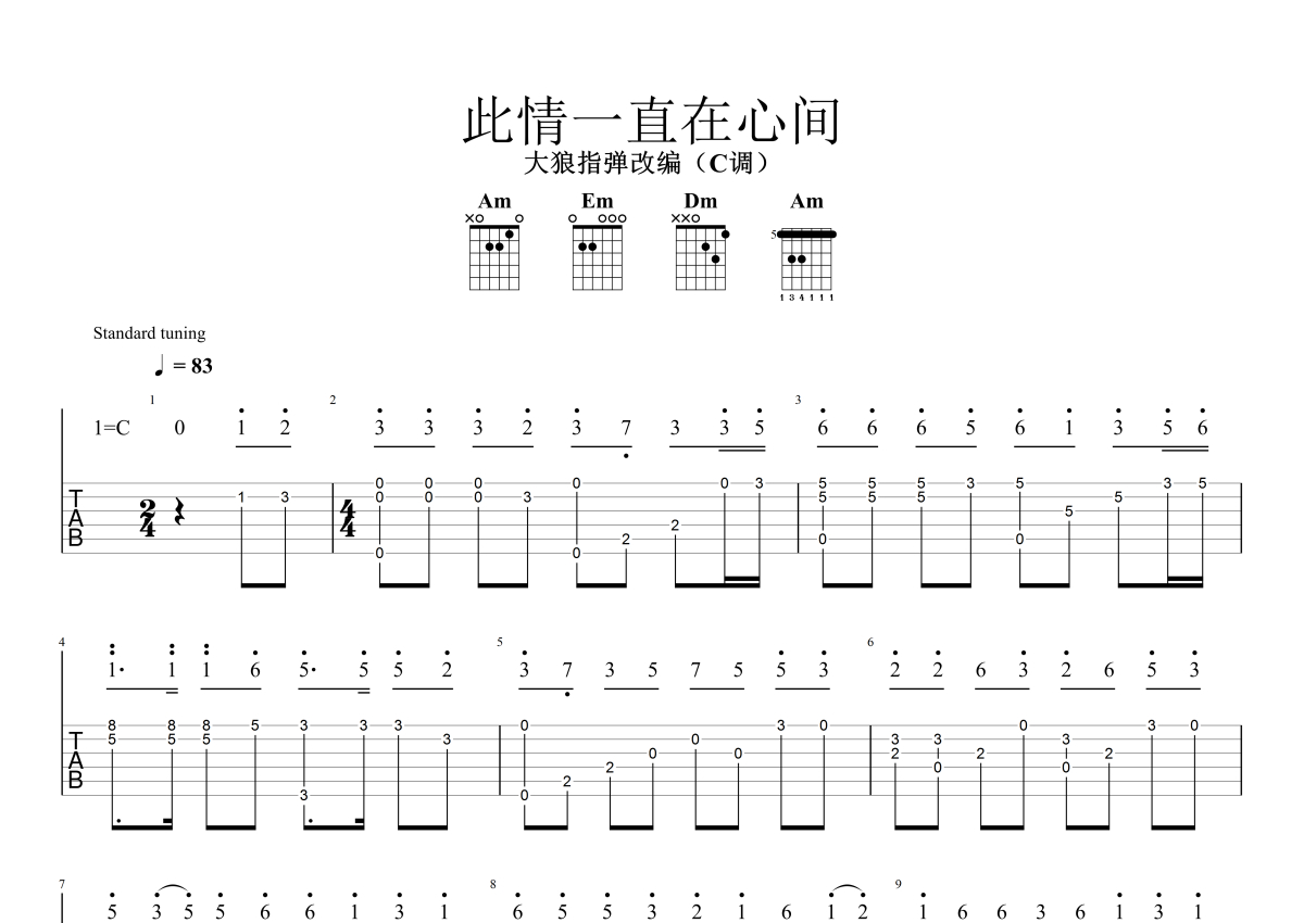 《此情一直在心间》是花姐演唱的一首歌曲,指弹,本吉他谱采用的是C调指法编配,这份吉他谱共有两张高清图谱,图谱由 @大狼指弹 编配上传,图谱使用六线谱编配,曲谱配备了相关的音频提供试听,使用这份此情一直在心间吉他谱,可以让你更加方便地掌握这首歌曲的演奏技巧,快来尝试吧。《此情一直在心间》吉他指弹谱,C调指法编配,难度不大。