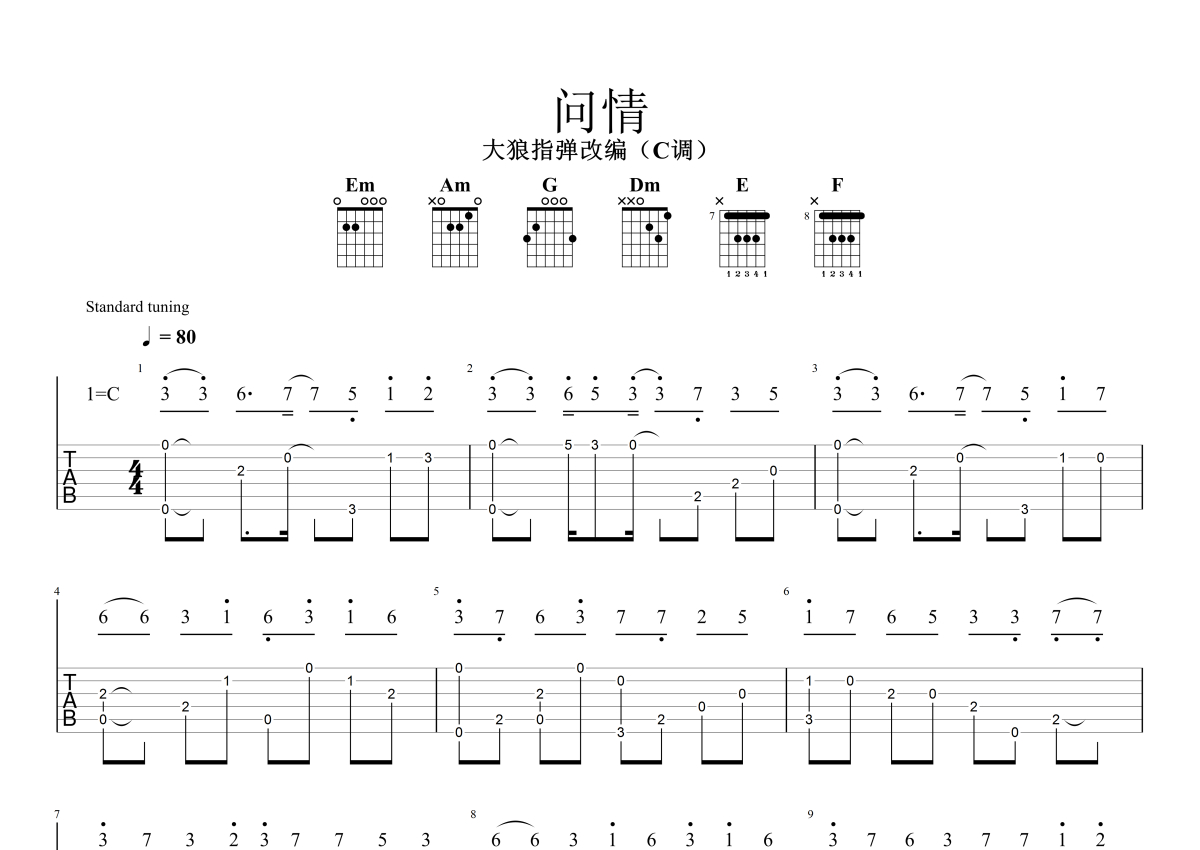 《问情》是蔡幸娟演唱的一首歌曲,指弹,本吉他谱采用的是C调指法编配,这份吉他谱共有两张高清图谱,图谱由 @大狼指弹 编配上传,图谱使用六线谱编配,曲谱配备了相关的音频提供试听,使用这份问情吉他谱,可以让你更加方便地掌握这首歌曲的演奏技巧,快来尝试吧。《戏说乾隆》主题曲-《问情》吉他独奏谱,C调指法编配,难度不大。