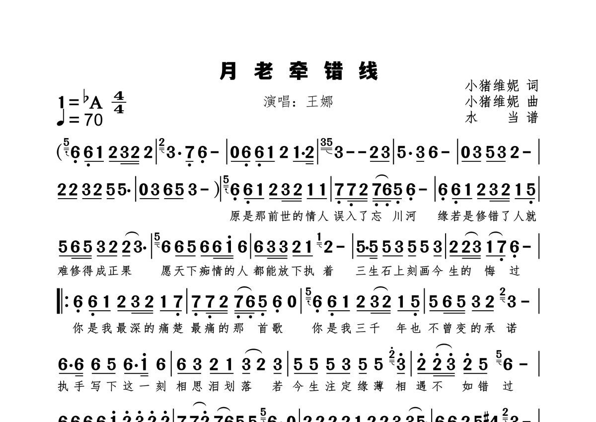《月老牵错线》是王娜演唱的一首歌曲,拍号为4/4拍,歌曲速度为每分钟70拍,这份简谱共有一张高清图谱,图谱由 @水当 编配上传原调bA。