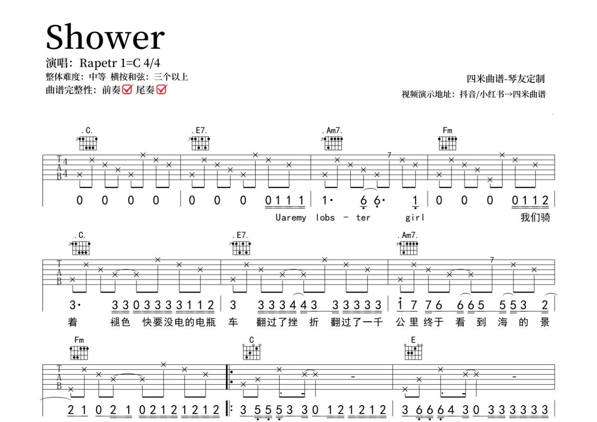 Rapeter《Shower》吉他谱 - C调弹唱六线谱