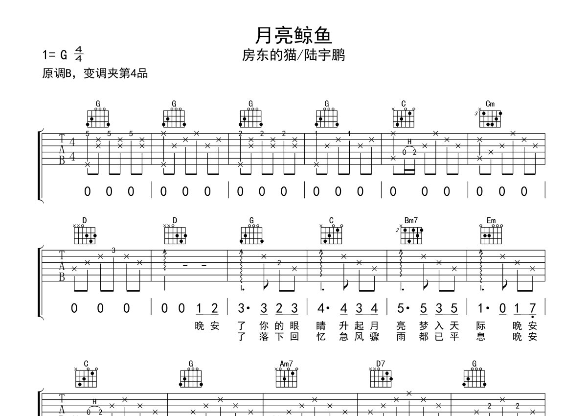 房东的猫/陆宇鹏《月亮鲸鱼》吉他谱 - G调弹唱六线谱