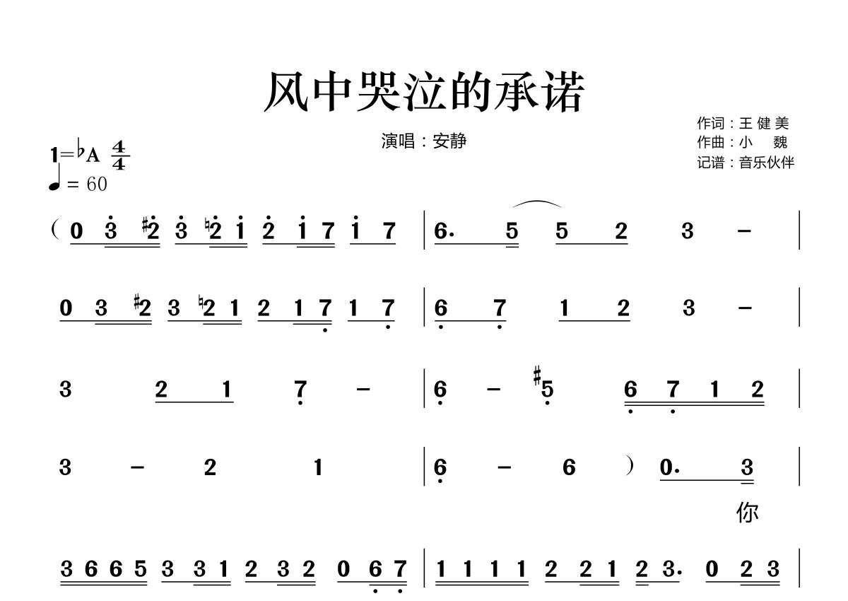 《风中哭泣的承诺》是安静演唱的一首歌曲,拍号为4/4拍,歌曲速度为每分钟60拍,这份简谱共有两张高清图谱,图谱由 @音乐伙伴 编配上传。