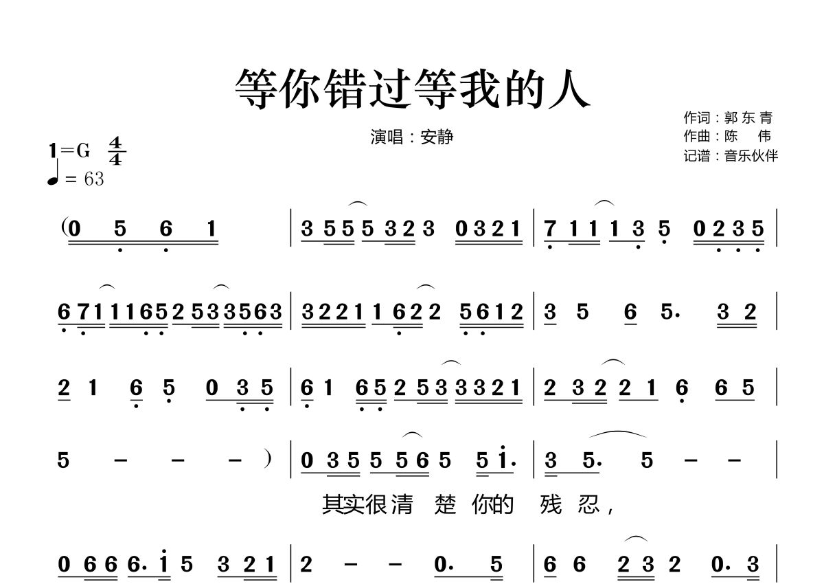 《等你错过等我的人》是安静演唱的一首歌曲,拍号为4/4拍,歌曲速度为每分钟63拍,这份简谱共有两张高清图谱,图谱由 @音乐伙伴 编配上传。