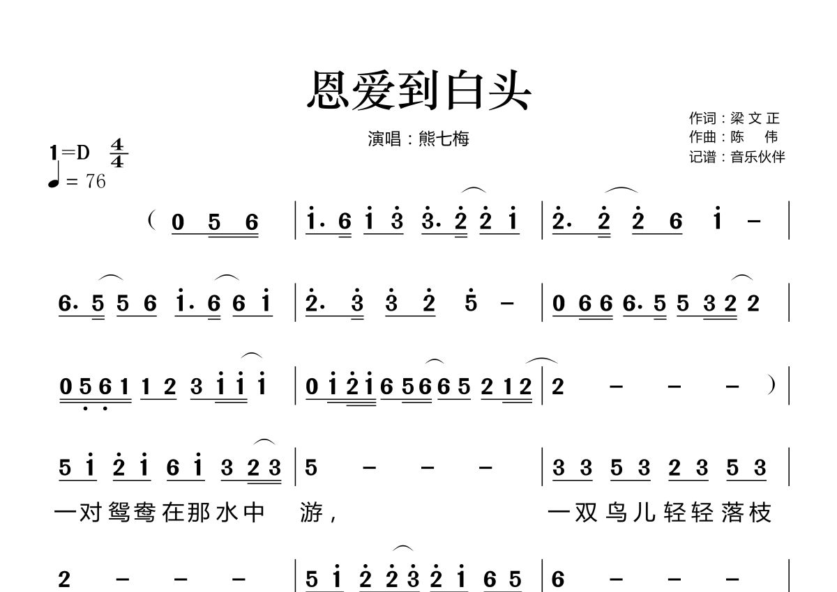 《恩爱到白头》是熊七梅演唱的一首歌曲,拍号为4/4拍,歌曲速度为每分钟76拍,这份简谱共有两张高清图谱,图谱由 @音乐伙伴 编配上传。
