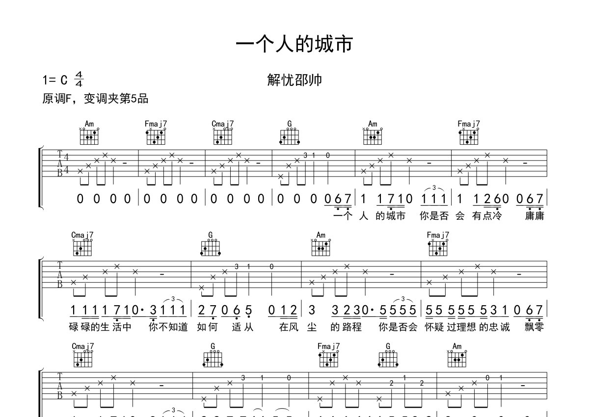 解忧邵帅《一个人的城市》吉他谱 - C调弹唱六线谱