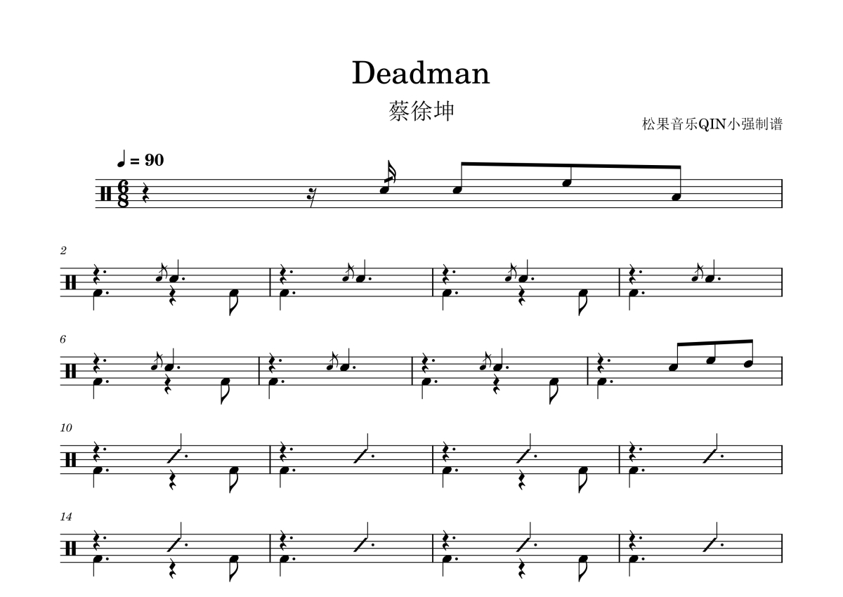 《Deadman》是蔡徐坤演唱的一首歌曲,拍号为6/8拍,这份架子鼓谱共有三张高清图谱,图谱由 @松果音乐QIN小强 编配上传,图谱使用五线谱编配,使用这份Deadman架子鼓谱,你将能够轻松地敲打出这首蔡徐坤的Deadman,快来尝试吧。《Deadman》是蔡徐坤演唱的节奏蓝调歌曲,由蔡徐坤、Jacob Ray、Mark Mckenna、Kurtis Wells、Fussy、Jonathan Cunningham创作词曲,于2025年5月28日通过单曲形式发行。