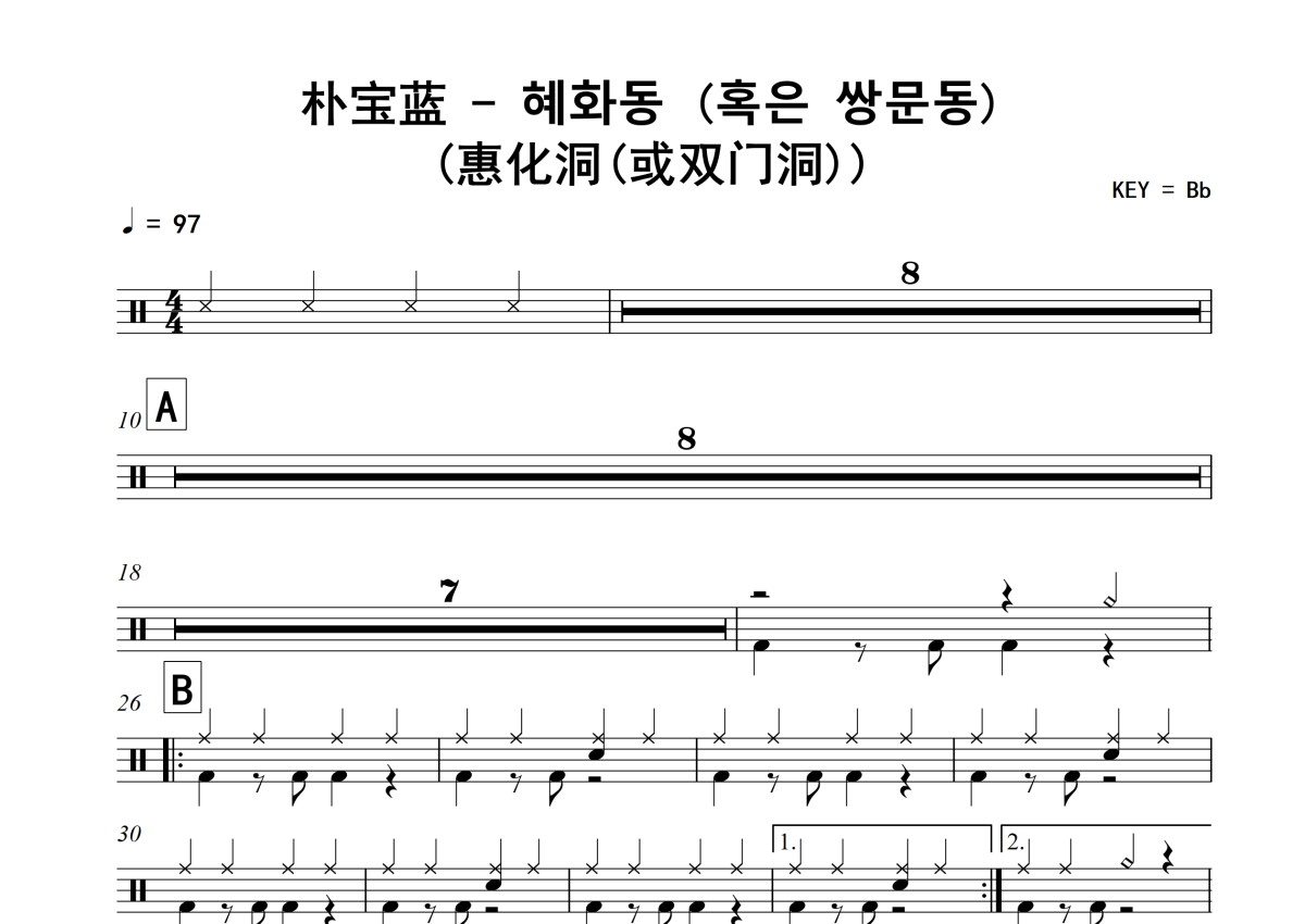 朴宝蓝《혜화동 (혹은 쌍문동) (惠化洞(或双门洞))》架子鼓谱
