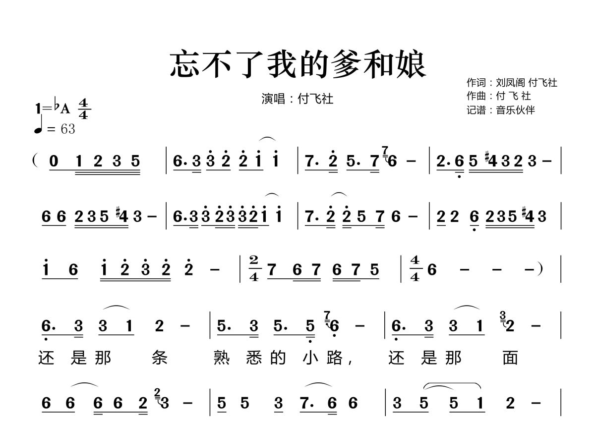 《忘不了我的爹和娘》是付飞社演唱的一首歌曲,拍号为4/4拍,歌曲速度为每分钟63拍,这份简谱共有两张高清图谱,图谱由 @音乐伙伴 编配上传。