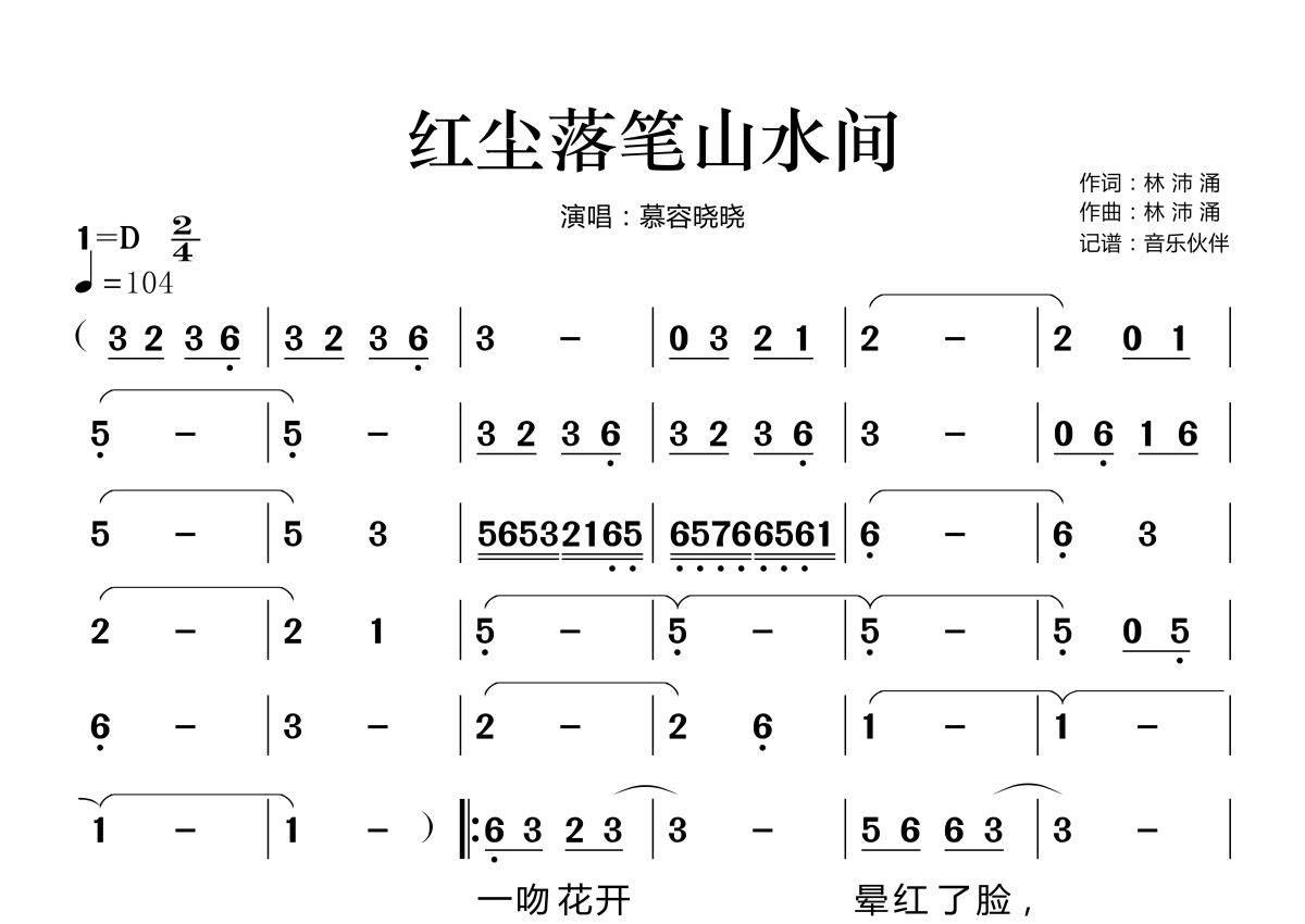 《红尘落笔山水间》是慕容晓晓演唱的一首歌曲,拍号为2/4拍,歌曲速度为每分钟104拍,这份简谱共有两张高清图谱,图谱由 @音乐伙伴 编配上传。