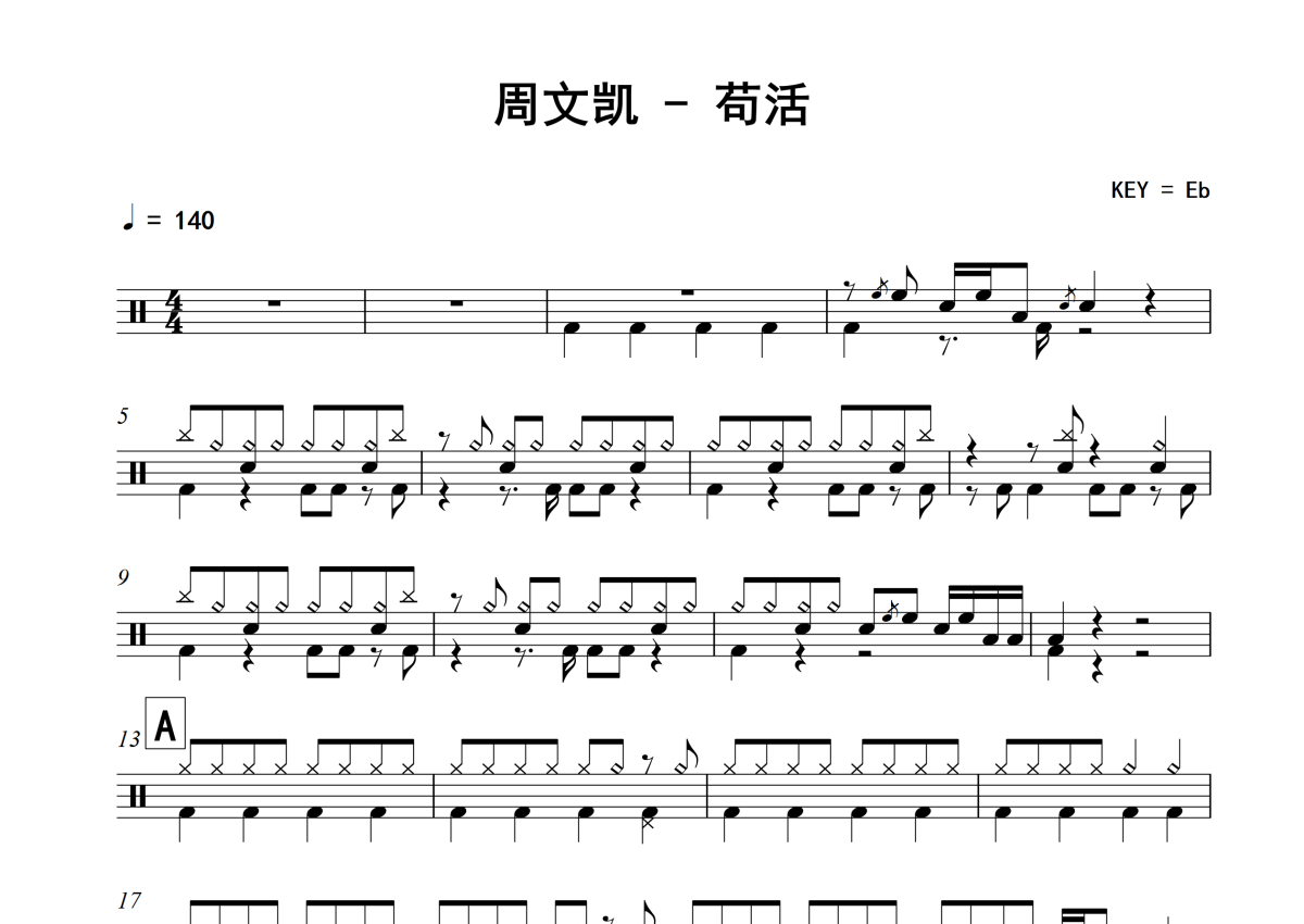 《苟活》是周文凯演唱的一首歌曲,拍号为4/4拍,歌曲速度为每分钟140拍,这份架子鼓谱共有三张高清图谱,图谱由 @老天师丶 编配上传,图谱使用五线谱编配,使用这份苟活架子鼓谱,你将能够轻松地敲打出这首周文凯的苟活,快来尝试吧。