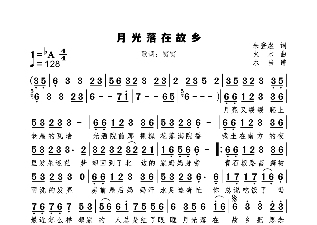 《月光落在故乡》是窝窝演唱的一首歌曲,拍号为4/4拍,歌曲速度为每分钟128拍,这份简谱共有一张高清图谱,图谱由 @水当 编配上传原调bA。