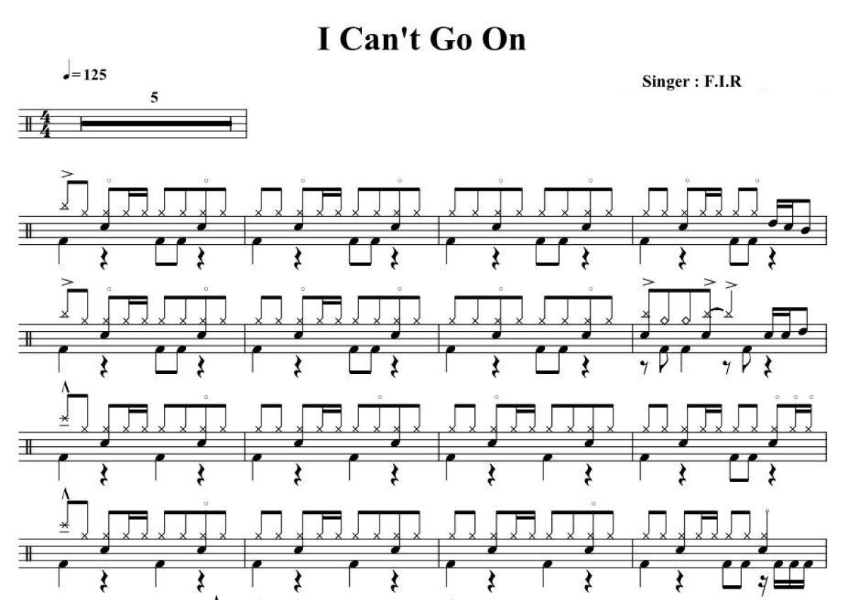 《I Can't Go On》是飞儿乐团演唱的一首歌曲,拍号为4/4拍,歌曲速度为每分钟125拍,这份架子鼓谱共有两张高清图谱,图谱由 @音符喷血者 编配上传,图谱使用五线谱编配,使用这份I Can't Go On架子鼓谱,你将能够轻松地敲打出这首飞儿乐团的I Can't Go On,快来尝试吧。