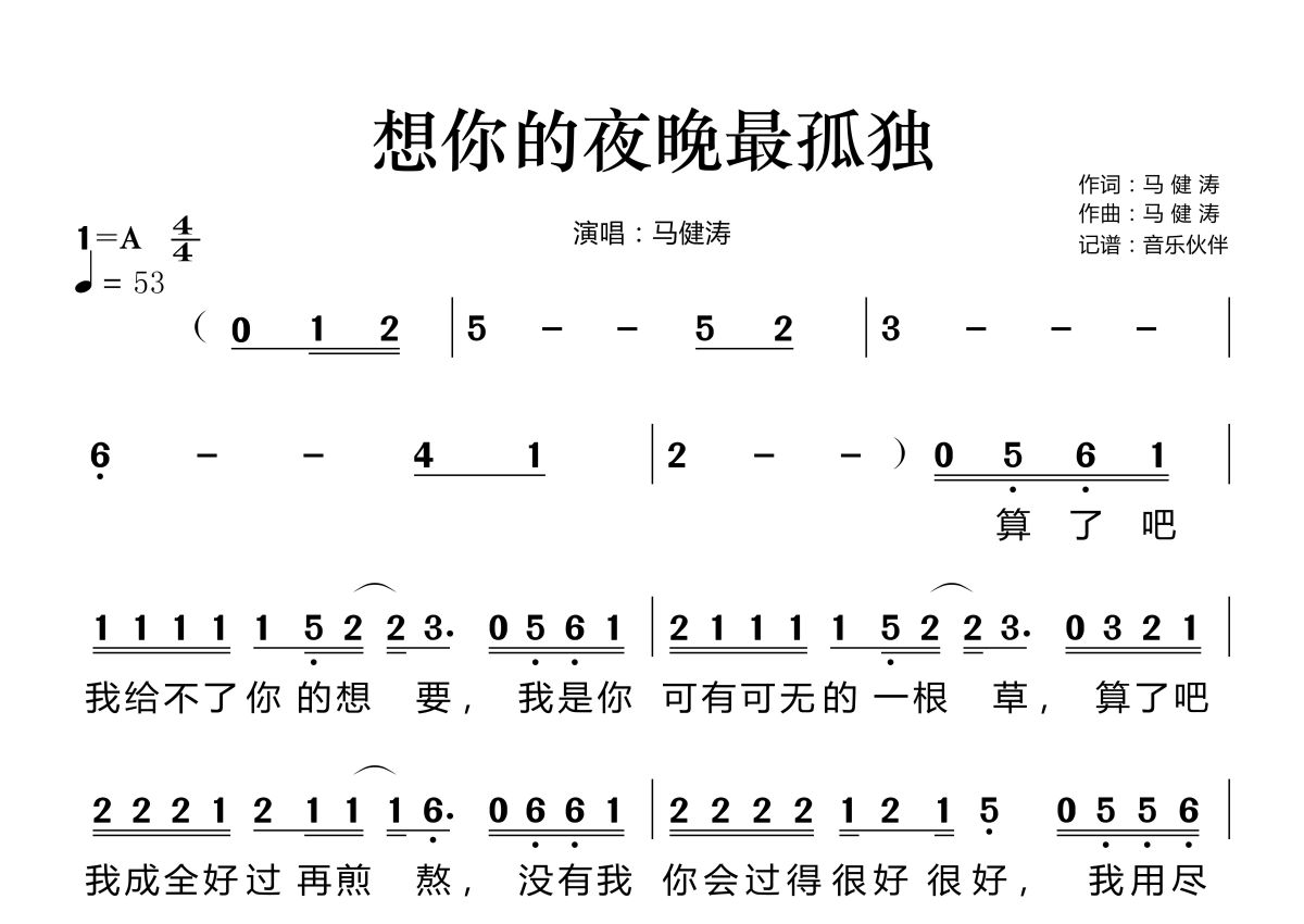 《想你的夜晚最孤独》是马健涛演唱的一首歌曲,拍号为4/4拍,歌曲速度为每分钟53拍,这份简谱共有两张高清图谱,图谱由 @音乐伙伴 编配上传。