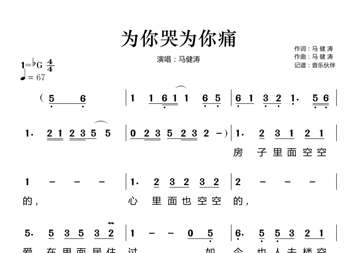 为你哭为你痛简谱 - 马健涛演唱