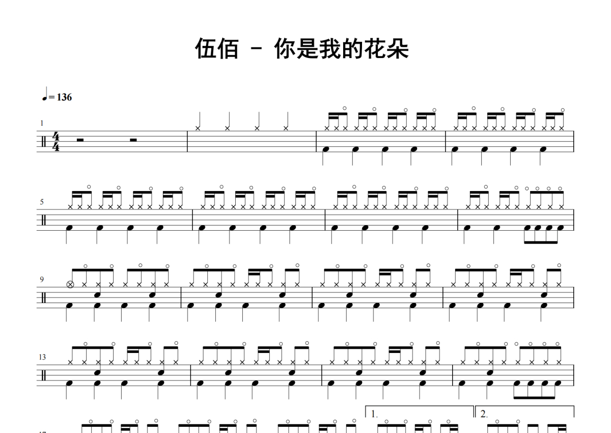 《你是我的花朵》是伍佰演唱的一首歌曲,这份架子鼓谱共有三张高清图谱,图谱由 @16分音符 编配上传,图谱使用五线谱编配,使用这份你是我的花朵架子鼓谱,你将能够轻松地敲打出这首伍佰的你是我的花朵,快来尝试吧。
