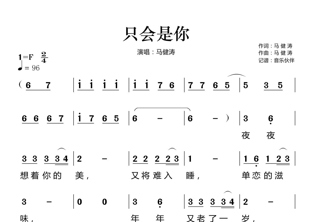 《只会是你》是马健涛演唱的一首歌曲,拍号为2/4拍,歌曲速度为每分钟96拍,这份简谱共有两张高清图谱,图谱由 @音乐伙伴 编配上传。