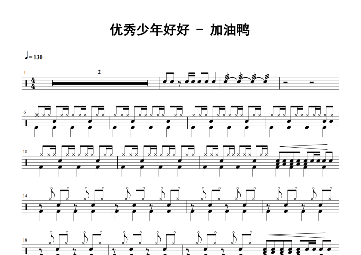 《加油鸭》是优秀少年好好演唱的一首歌曲,这份架子鼓谱共有两张高清图谱,图谱由 @16分音符 编配上传,图谱使用五线谱编配,使用这份加油鸭架子鼓谱,你将能够轻松地敲打出这首优秀少年好好的加油鸭,快来尝试吧。