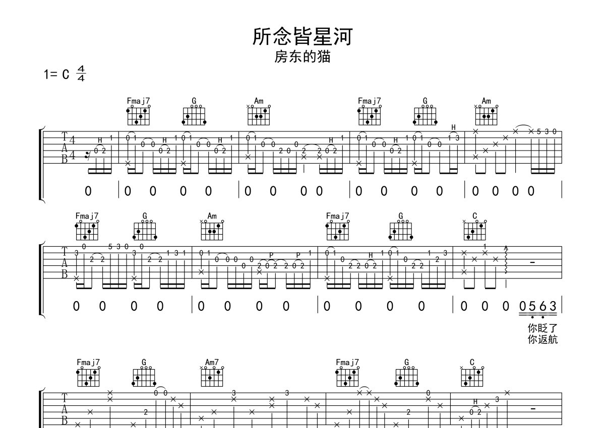 房东的猫《所念皆星河》吉他谱 - C调弹唱六线谱