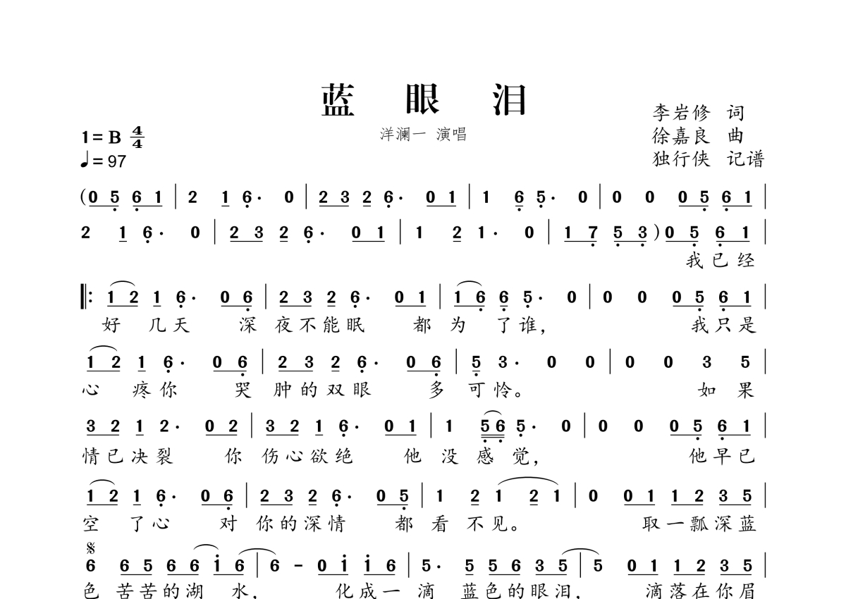 《蓝眼泪》是洋澜一演唱的一首歌曲,拍号为4/4拍,歌曲速度为每分钟97拍,这份简谱共有一张高清图谱,图谱由 @独行侠 编配上传。