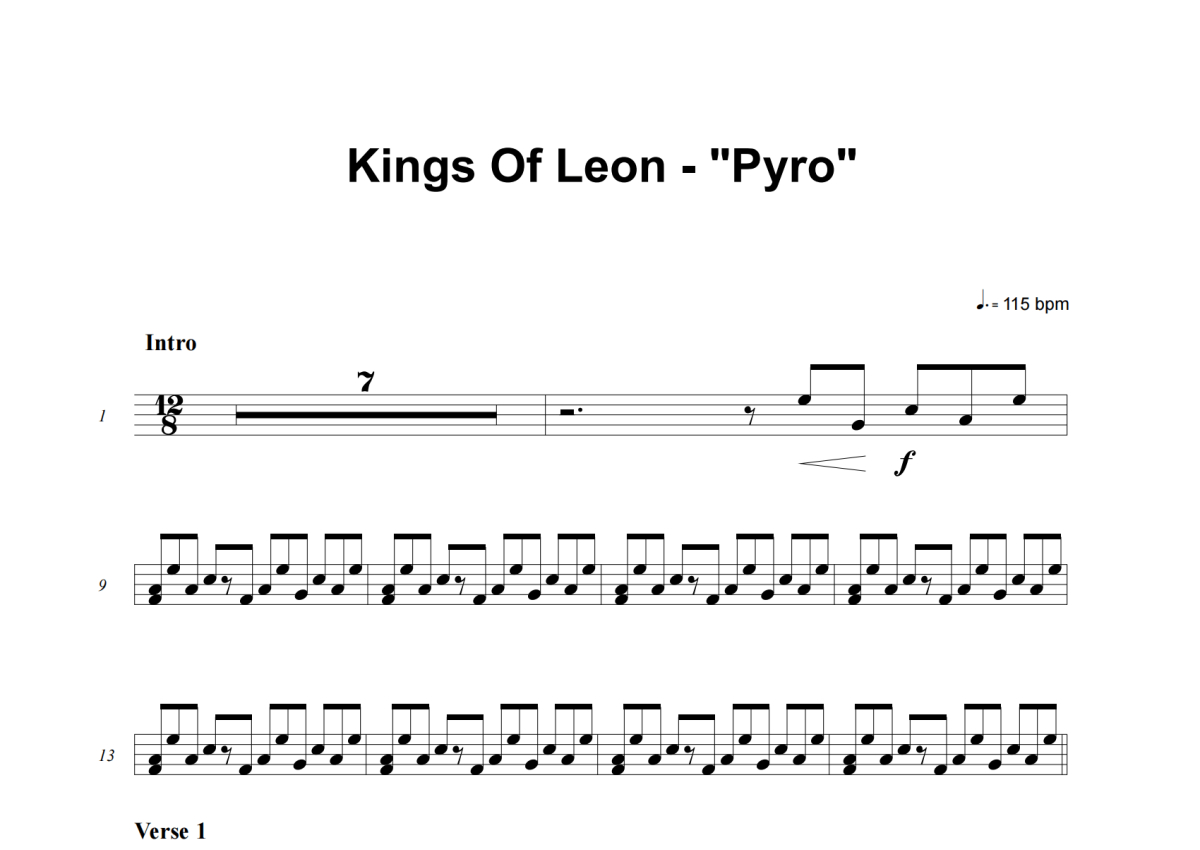 《Pyro》是Kings Of Leon演唱的一首歌曲,这份架子鼓谱共有四张高清图谱,图谱由 @16分音符 编配上传,图谱使用五线谱编配,使用这份Pyro架子鼓谱,你将能够轻松地敲打出这首Kings Of Leon的Pyro,快来尝试吧。