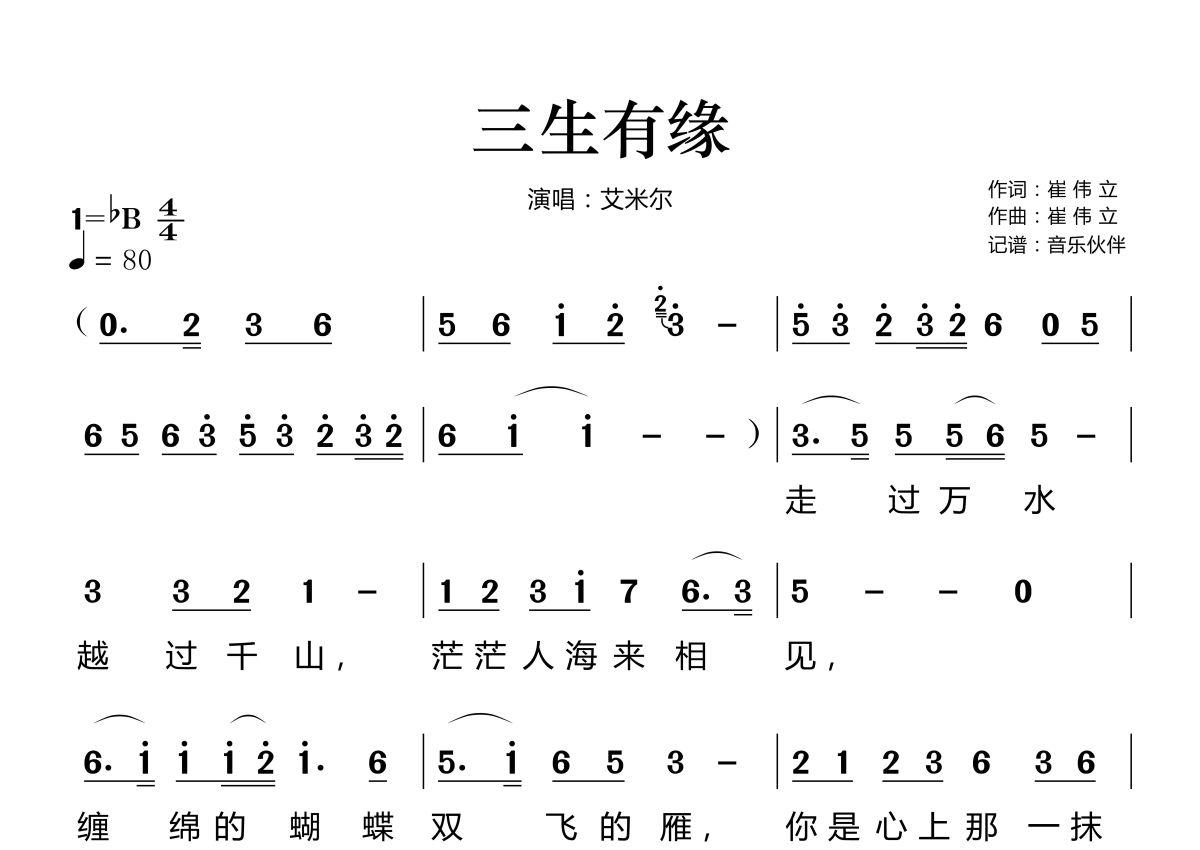 《三生有缘》是艾米尔演唱的一首歌曲,拍号为4/4拍,歌曲速度为每分钟80拍,这份简谱共有两张高清图谱,图谱由 @音乐伙伴 编配上传。