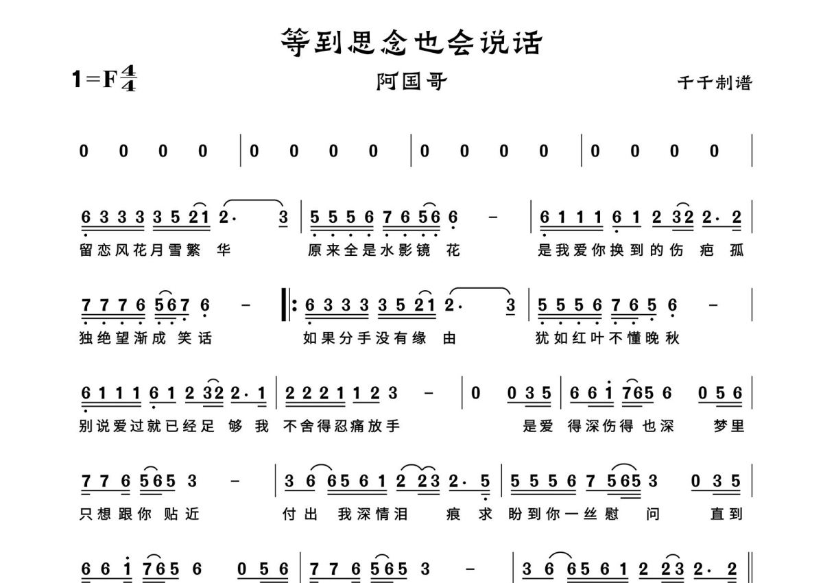 《等到思念也会说话》是阿国哥演唱的一首歌曲,拍号为4/4拍,这份简谱共有一张高清图谱,图谱由 @千千 编配上传。