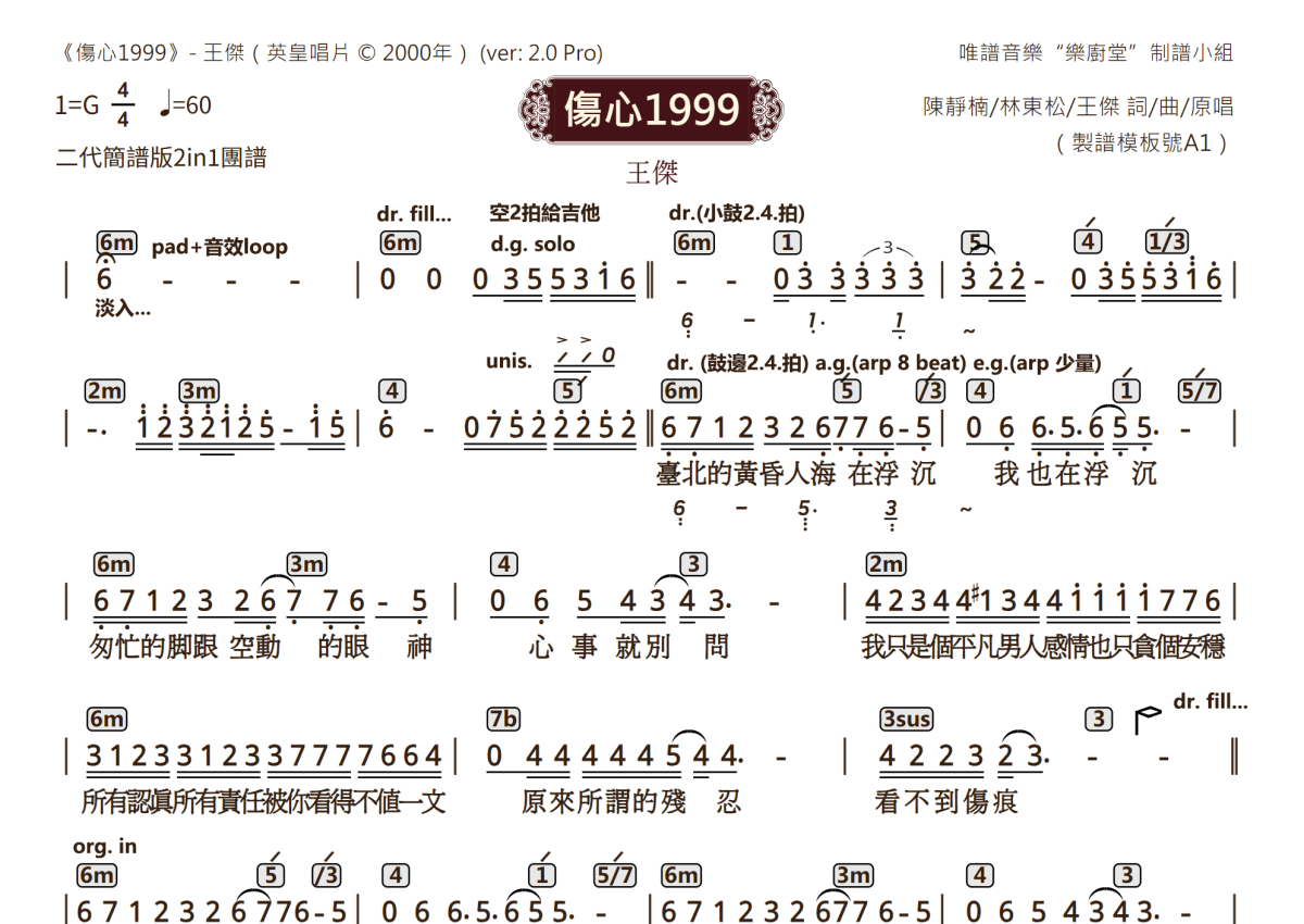 王杰《伤心1999》乐队总谱 - 2.0版2in1团谱