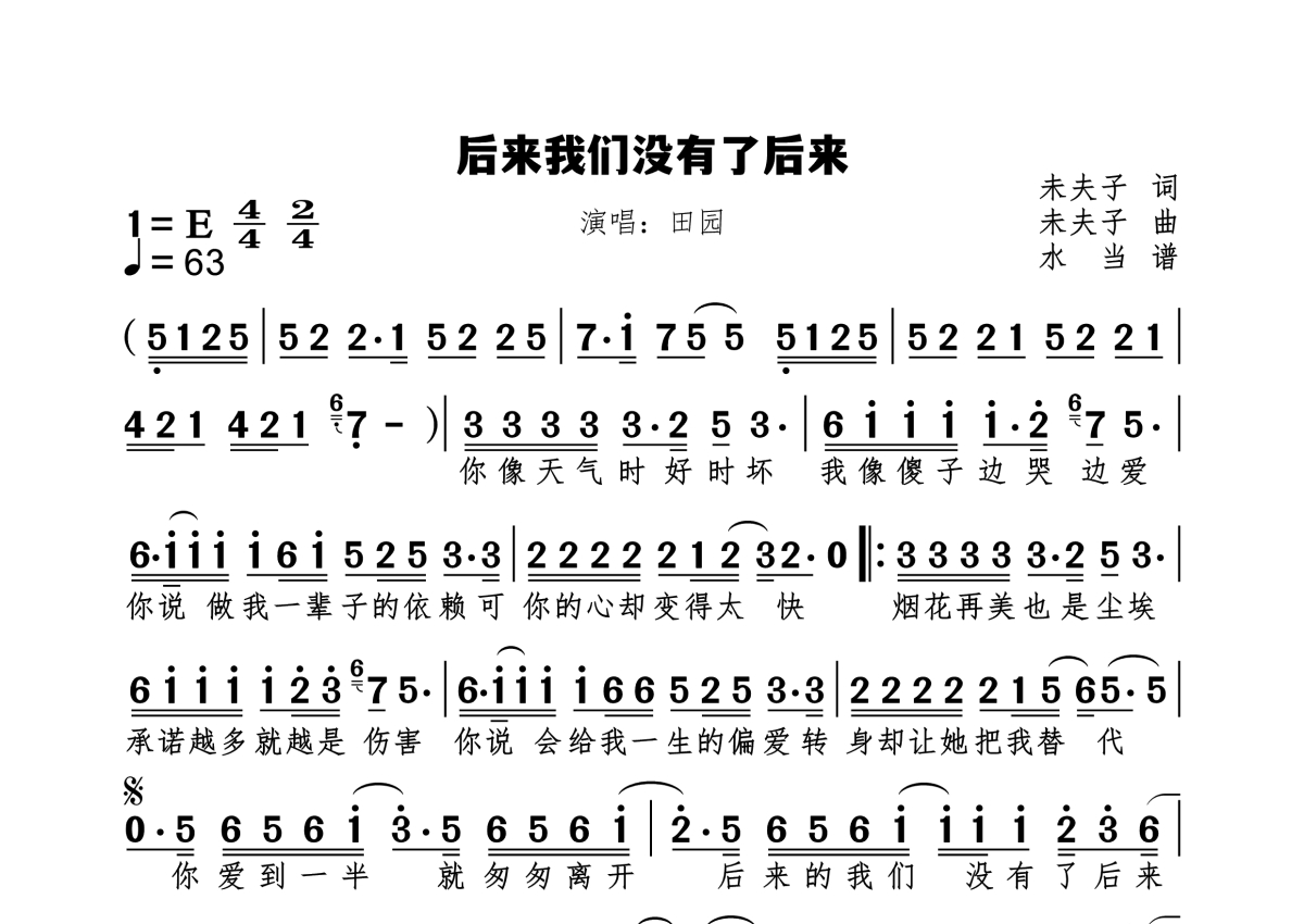《后来我们没有了后来》是田园演唱的一首歌曲,这份简谱共有一张高清图谱,图谱由 @水当 编配上传原调E。