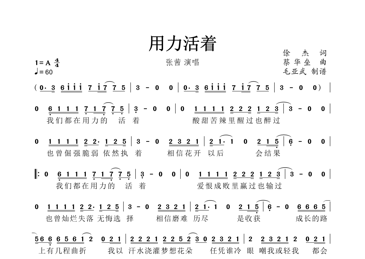 用力活着简谱 - 张茜演唱