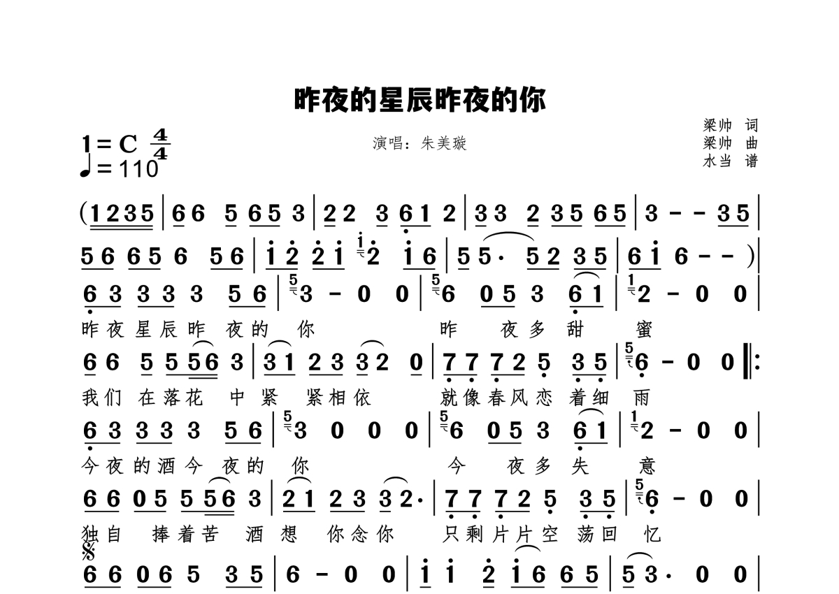 《昨夜的星辰昨夜的你》是朱美璇演唱的一首歌曲,拍号为4/4拍,歌曲速度为每分钟110拍,这份简谱共有一张高清图谱,图谱由 @水当 编配上传原调C。