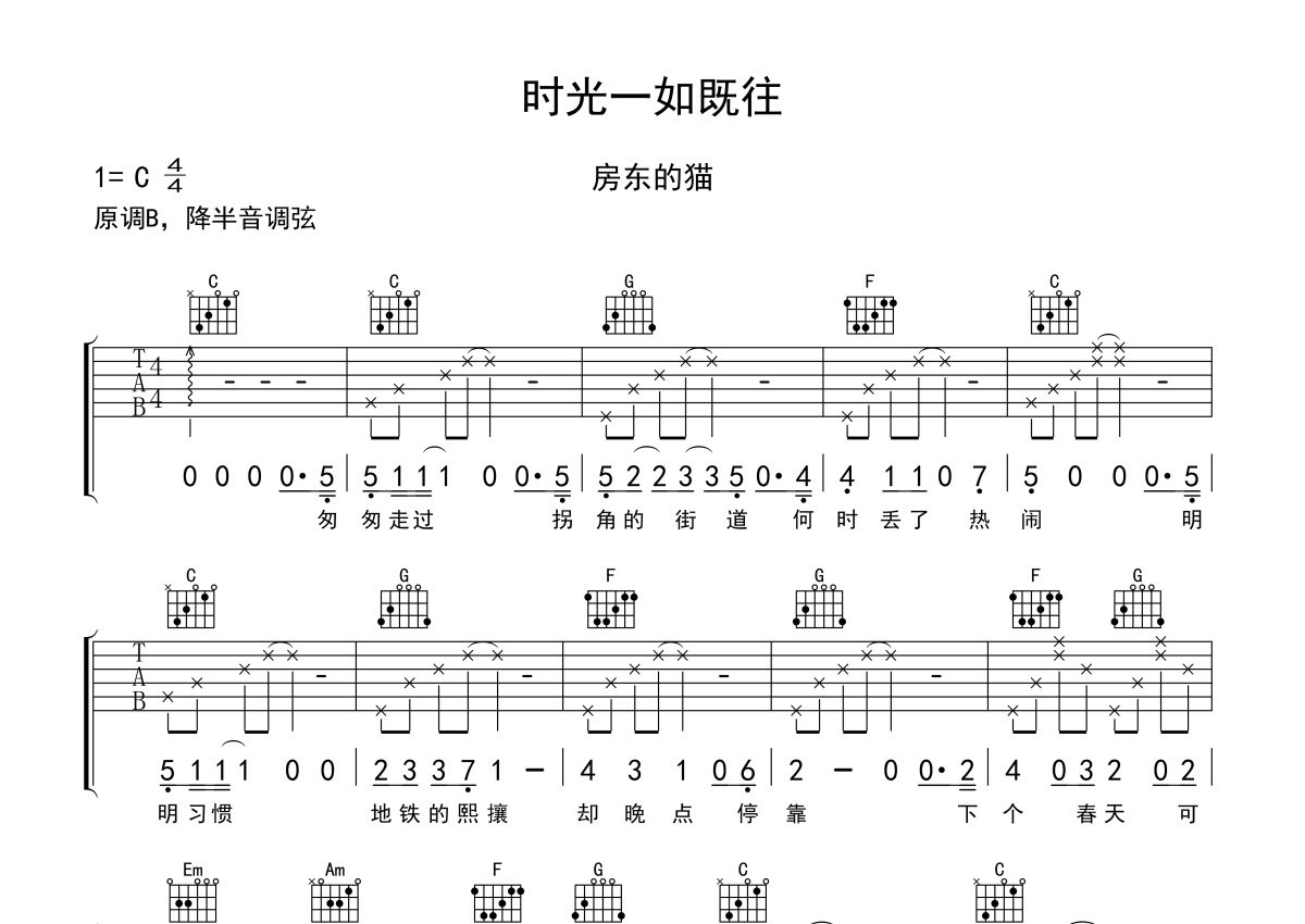 房东的猫《时光一如既往》吉他谱 - C调弹唱六线谱
