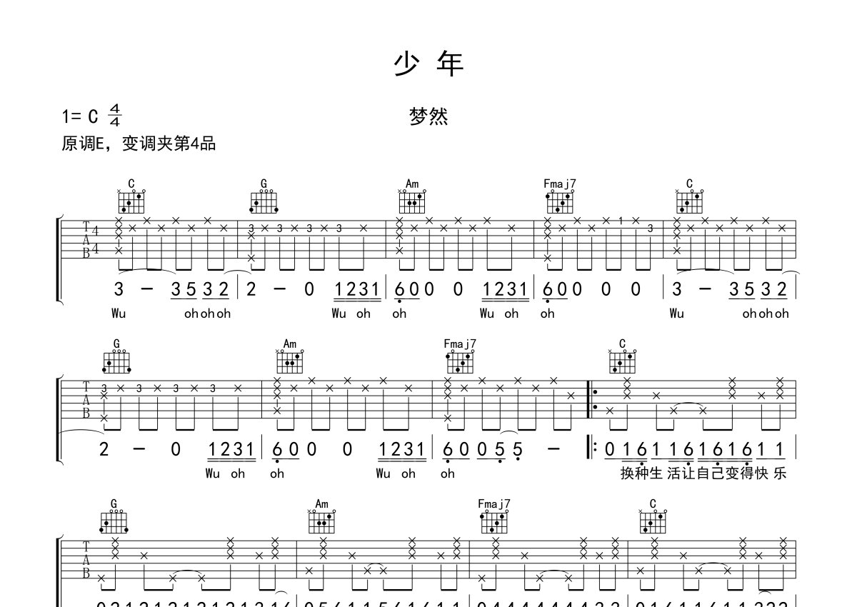 梦然《少年》吉他谱 - C调弹唱六线谱