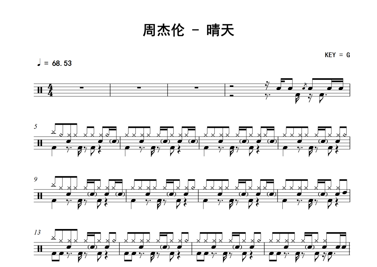《晴天》是周杰伦演唱的一首歌曲,拍号为4/4拍,歌曲速度为每分钟68拍,这份架子鼓谱共有两张高清图谱,图谱由 @老天师丶 编配上传,图谱使用五线谱编配,使用这份晴天架子鼓谱,你将能够轻松地敲打出这首周杰伦的晴天,快来尝试吧。